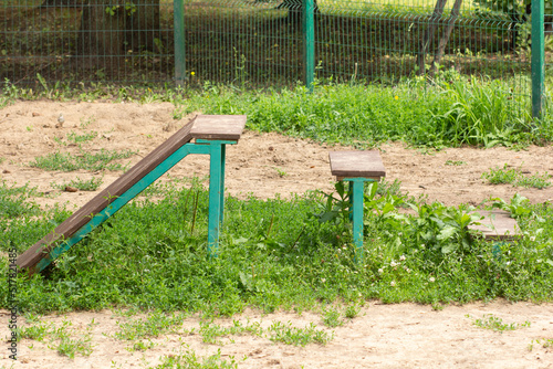 © Tatiana Foxy, Fototapeta premium Wooden bar jump hurdles wall barriers of different height for dog training in park for dog