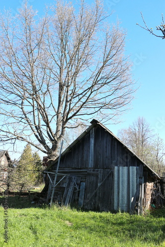 © Andrey, Obraz premium Wooden barn and big tree in spring in the village
