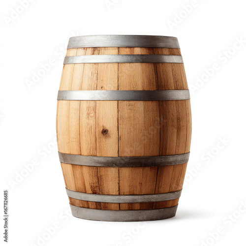 © Nualsri, Obraz premium Wooden barrel with metal bands isolated on white background
