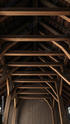 Fototapeta premium Wooden beam structure with exposed dark wood studs, industrial decor, dark wood, warehouse interior