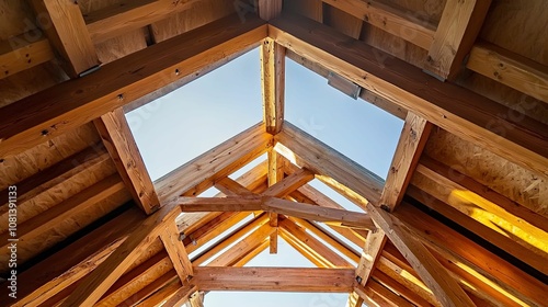 Obraz premium Wooden Beams and Framing for a Roof with a Glimpse of Blue Sky