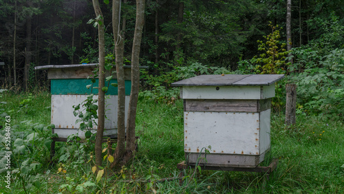 © kalyanby, Fototapeta premium Wooden beehives and bees in apiary in the forest. Beekeeping or apiculture concepts.
