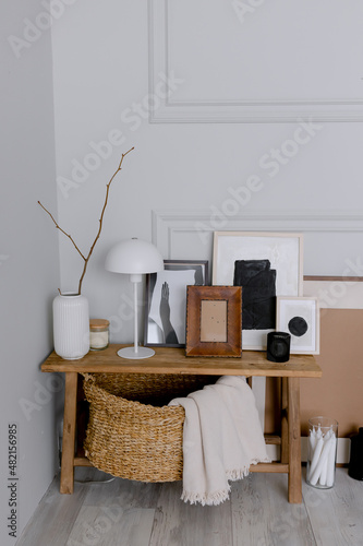 © Hanna Chayka, Obraz premium Wooden bench in the room Scandinavian style interior accessories Lamp and vase with photo frames Wicker basket with plaid for decor
