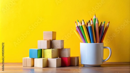 © kavalin, Obraz premium Wooden blocks and colored pencils in a white mug on a table with a bright yellow background.