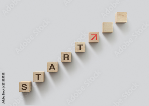 Obraz premium Wooden blocks arranged in stair shape with the word START. Start, Start up,...