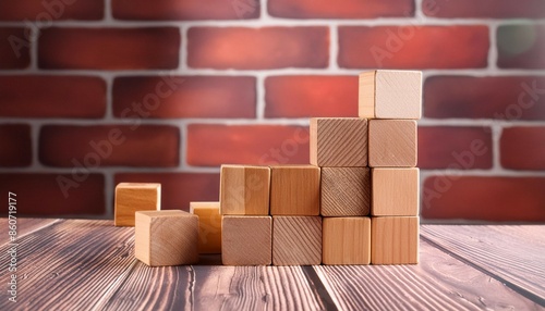 © Verdiana, Obraz premium Wooden blocks built on wooden boards and faded brick backgrounds