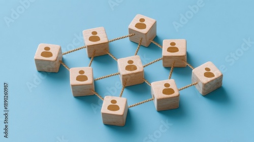 © 69, Obraz premium Wooden Blocks Connected by Strings Represents Networking and Collaboration Concepts in a Creative Visualization