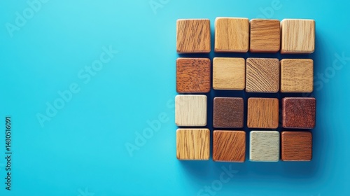 © Zarana , Obraz premium Wooden blocks connected together on a blue background. Teamwork concept.