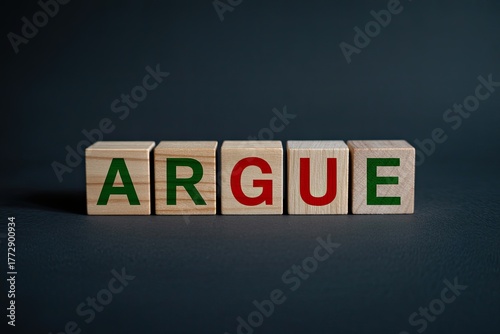 © Kazi, Obraz premium Wooden blocks spelling argue concept communication conflict disagreement dispute debate discussion conflict resolution creative idea