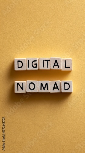 Obraz premium Wooden blocks spelling out digital nomad on a yellow background represent the...