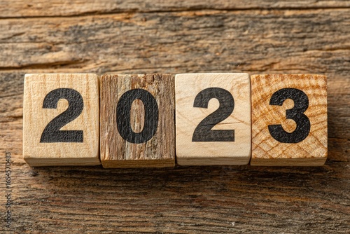 © Accordpansy, Fototapeta premium Wooden blocks spelling out 2023 on a rustic wooden surface (2)