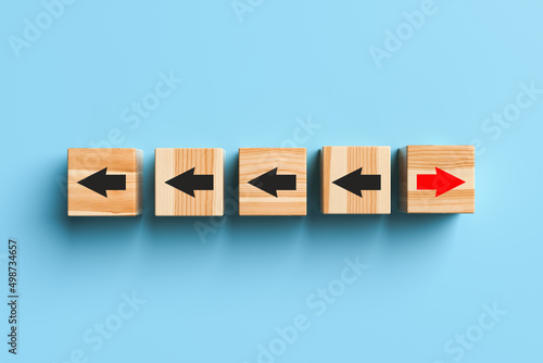 Obraz premium Wooden blocks with arrows with one stand out from the crowd and move forward...