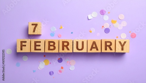 Fototapeta premium Wooden Blocks with Date 7 February. Calendar for birthday or anniversary on solid colored background with confetti