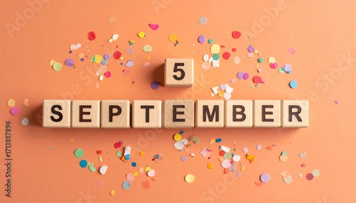 © Kim de Been, Fototapeta premium Wooden Blocks with Date 5 September. Calendar for birthday or anniversary on solid colored background with confetti