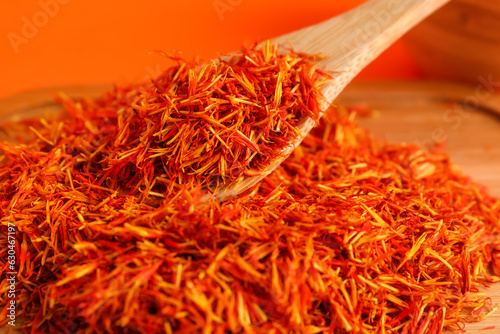 © Pixel-Shot, Fototapeta premium Wooden board and spoon with pile of saffron on orange background