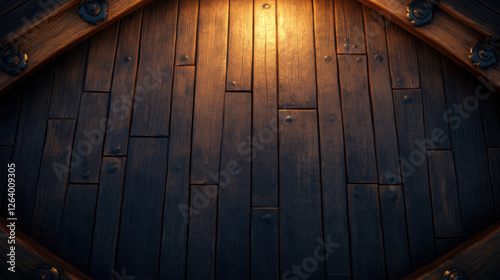 © Keopaserth, Fototapeta premium Wooden board background from pirate ship, featuring dark planks and warm lighting, creating rustic and adventurous atmosphere