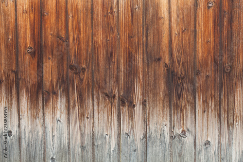 Naklejka premium Wooden Board background of dark burnt color with gradient in light color. Wooden planks for Your text. Knots on the wooden surface. Vertical strips of natural material in interiors and exteriors.