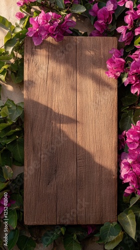 © Ashalina, Fototapeta premium Wooden board framed by bougainvillea, sunlight, mockup