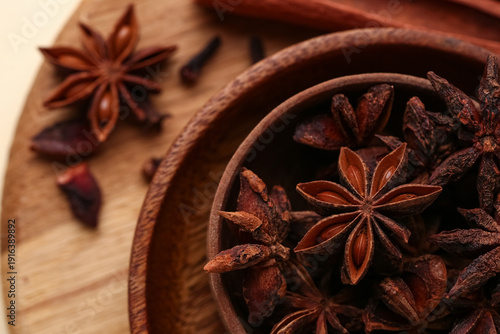 Fototapeta premium Wooden board with bowls of aromatic star anise, closeup