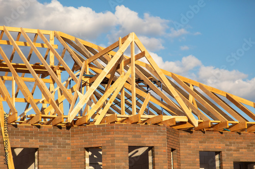Fototapeta premium Wooden boards on the roof of the house against the sky.