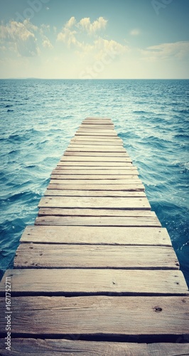 © phit, Obraz premium Wooden boardwalk extending into the ocean under a clear sky.