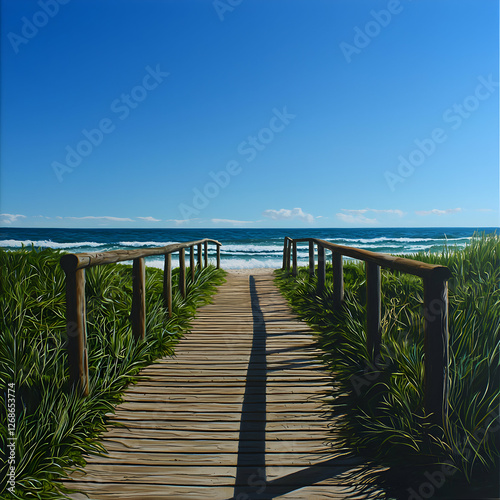 © Arthur Constantine, Obraz premium Wooden Boardwalk Leading to a Sandy Beach and Blue Ocean
