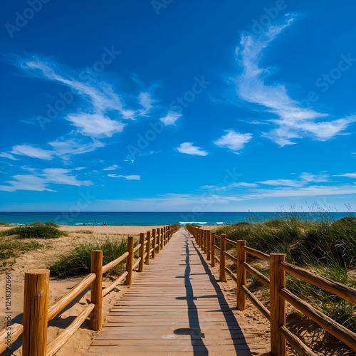 © Arthur Constantine, Fototapeta premium Wooden Boardwalk Leading to Sandy Beach Under a Blue Summer