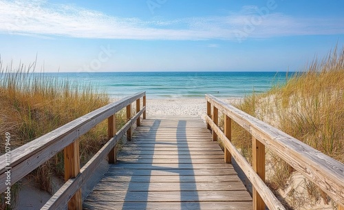 © k, Naklejka premium Wooden Boardwalk Leading to Serene Beach with Turquoise Waters and Golden Grasses