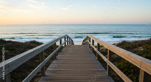 Fototapeta premium Wooden boardwalk leads to tranquil ocean shore.