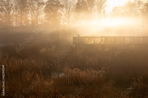 © Eric Dale Creative, Fototapeta premium Wooden boardwalk path in thick early morning fog overlooking marsh wetland at Dixon Meadow Preserve, Pennsylvania, USA