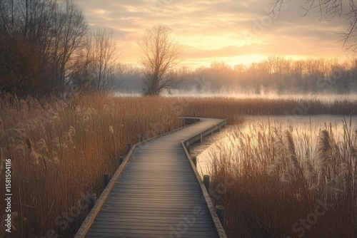 Naklejka premium Wooden boardwalk path leads through a misty autumnal marsh at sunrise
