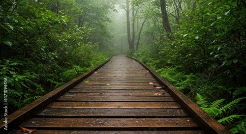 © Annada, Obraz premium Wooden boardwalk path through a lush green forest with fog in the background.