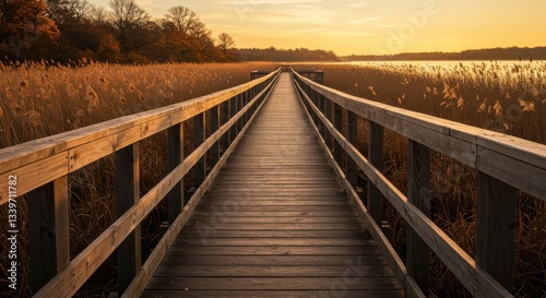 © Thecreator T, Fototapeta premium Wooden boardwalk stretches into the distance at sunset through tall golden reeds and a tranquil lake
