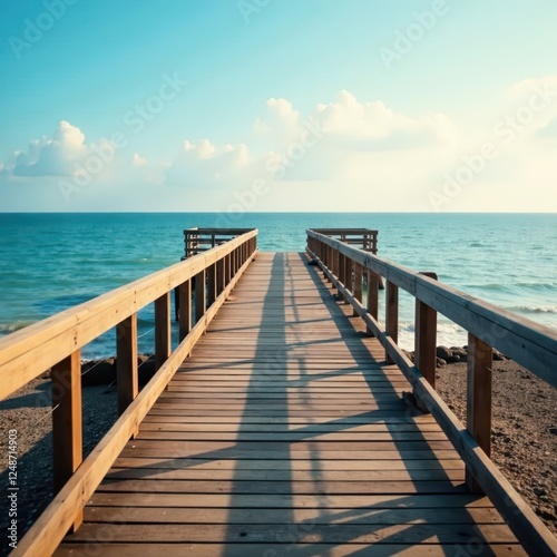 Fototapeta premium Wooden boardwalk stretching across scenic North Sea vista, horizon, germany,...