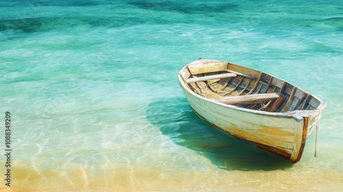 © DigitalDruid, Naklejka premium Wooden boat gently floating in clear turquoise waters, nestled against a serene tropical shoreline with soft sandy beach.