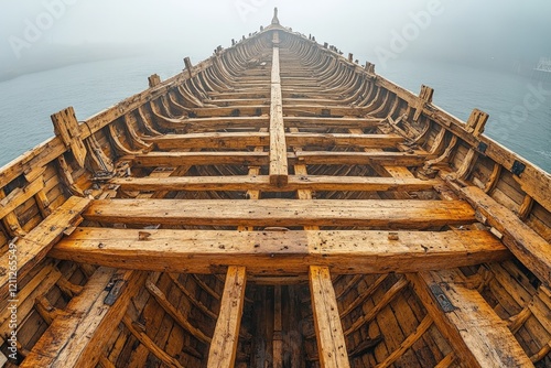 © Ali, Obraz premium Wooden boat hull, weathered, misty sea.