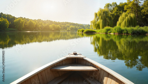 Fototapeta premium Wooden boat on a serene lake surrounded by lush greenery