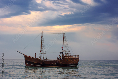 Fototapeta premium Wooden boat on a sunset background