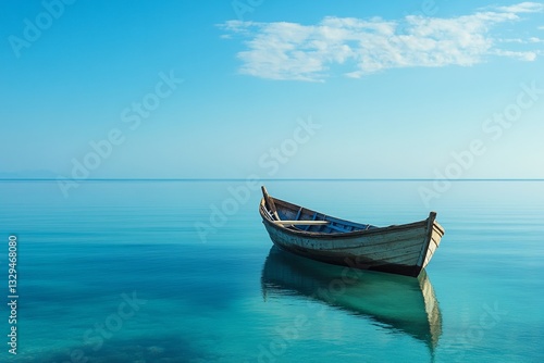 © vasyan_23, Naklejka premium Wooden boat on calm blue sea under clear sky