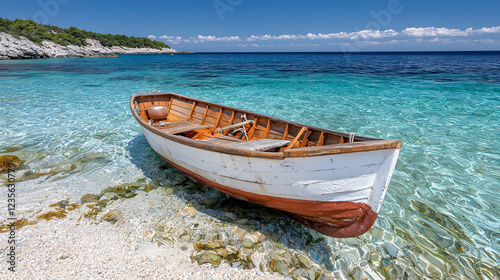 Naklejka premium Wooden boat on tranquil beach, clear water, sunny day, island background;...