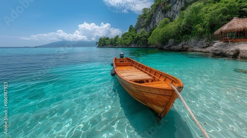 Naklejka premium Wooden boat on turquoise water near tropical island, clear day. Adventure and...