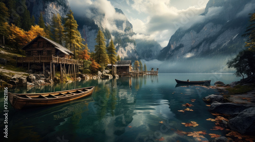 Naklejka premium wooden boat sitting on the dock with in the calm lake water with misty mountains and forest in the background