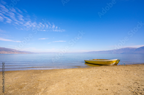 © netdrimeny, Naklejka premium Wooden boats at pier on mountain lake
