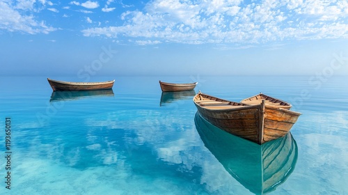 Naklejka premium Wooden boats floating peacefully on calm blue waters under a clear sky