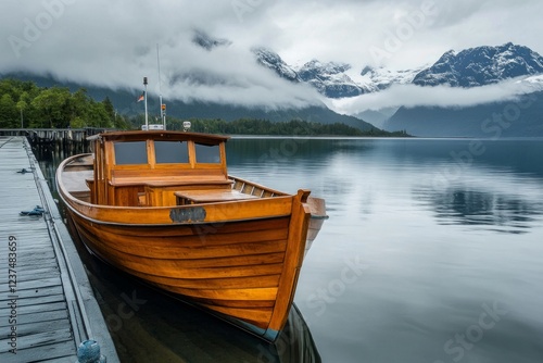 © aditya, Fototapeta premium Wooden boats moored at the pier with a beautiful sea view with bright blue clouds, fishing port pier and tourists