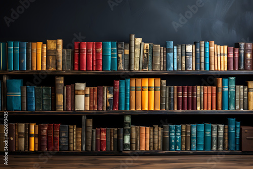 Fototapeta premium Wooden book shelf filled with books in various shape and sizes, hardwood...