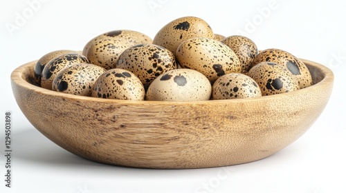 Obraz premium Wooden bowl filled with speckled quail eggs on white background