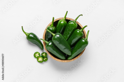 Fototapeta premium Wooden bowl with green jalapeno peppers on white background