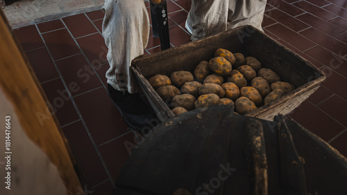 © Jakub, Naklejka premium Wooden Box Full of Dirty Potatoes, Scenography Detail with the Figure of a Soldier in Uniform in the Historic Kitchen