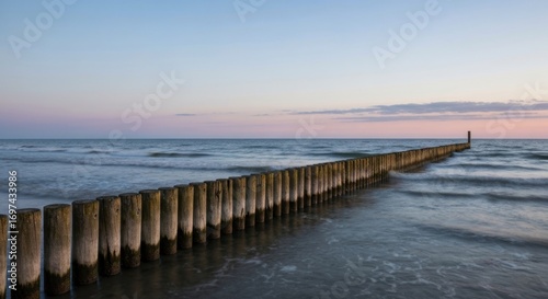 Obraz premium Wooden breakwater stretches into the sea during a soft sunset sky